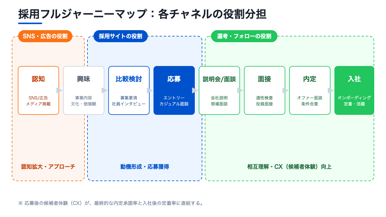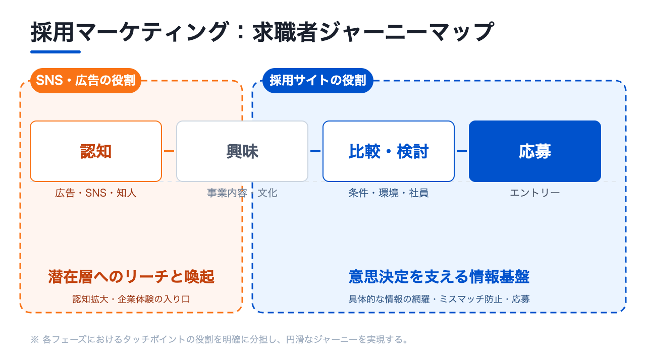 本記事では、採用マーケティングの全体像を「求職者ジャーニーマップ」というフレームワークを用いて整理し、なぜ採用サイトが採用活動の中心に位置づけられるのかを、段階ごとにわかりやすく解説していきます。