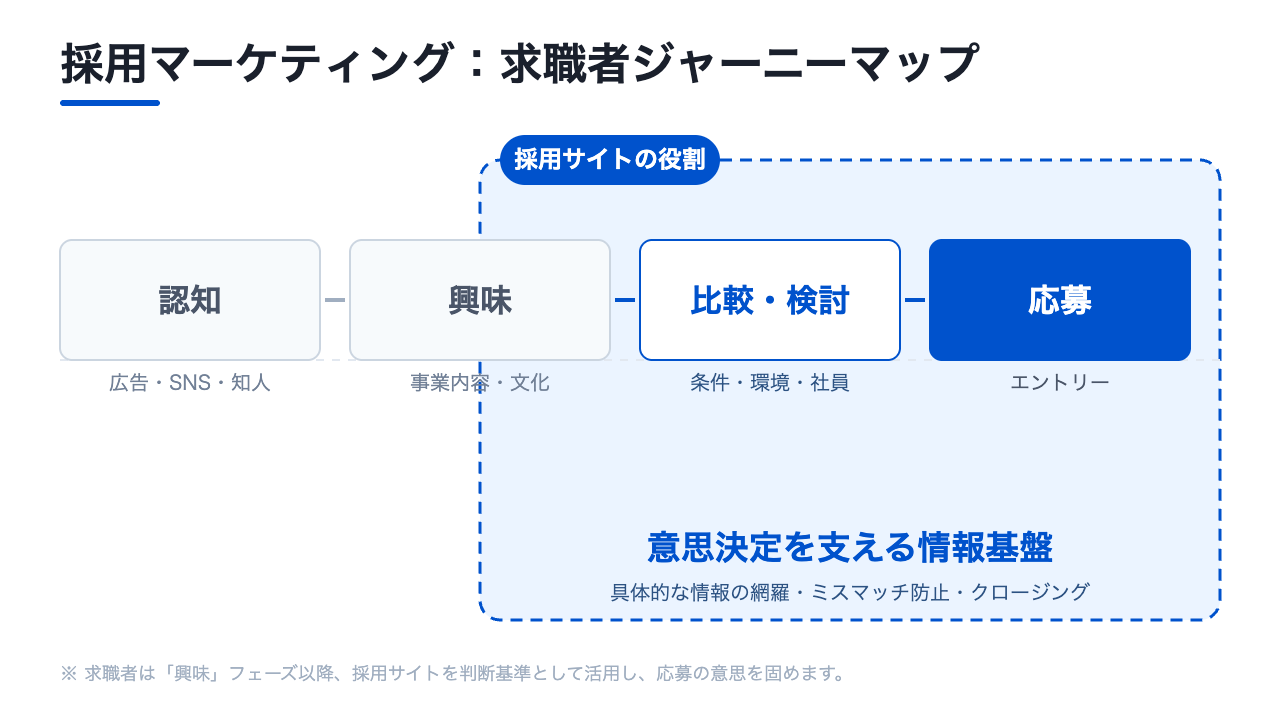 「興味」「比較検討」「応募」をカバーしていますが、ここでの情報発信が不十分だと求職者にとっては「本当にこの会社が自分に合っているのだろうか?」と疑問や不安を払拭できず、応募に踏み切りません。