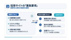応募が来ない原因の多くは、認知不足ではなく、この応募フェーズで不安を払拭しきれていないことにあります。採用サイトは、応募を促すためのツールではなく、「応募しても大丈夫だ」と背中を押すための受け皿なのです。