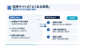 また、会社のビジョンやミッションと結びつけて解説することで、単なる人員補充ではなく、「一緒に成功を目指す仲間」であることが伝わります。よくある質問への回答や業務内容の概要、社内で得られる成長の機会をストーリーとして伝えることで、応募者は自分がその会社で働く未来を自然と描けるようになります。