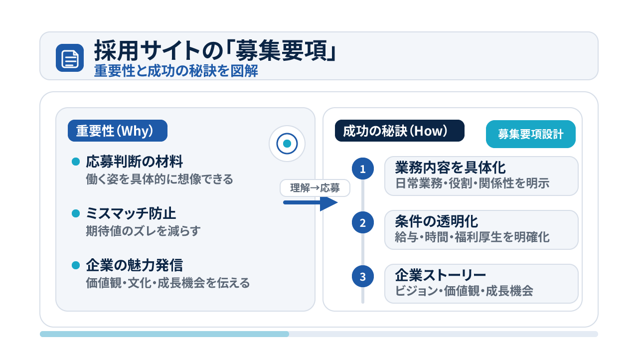 募集要項は、給与や条件を並べるだけの情報ページではありません。求職者にとっては「この会社で働く自分」を具体的に想像するための判断材料であり、企業にとっては「どんな人と出会いたいのか」を伝える最初のメッセージです。ここが曖昧なままでは、応募が集まらないだけでなく、入社後のミスマッチや早期離職にもつながります。